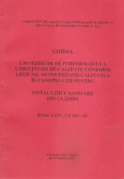 Normativ GT 063-04. Ghidul criteriilor de performanta a cerintelor de calitate conform Legii nr. 10/1995 privind calitatea in constructii pentru instalatiile sanitare din cladiri (Revizuire GT-020/98).